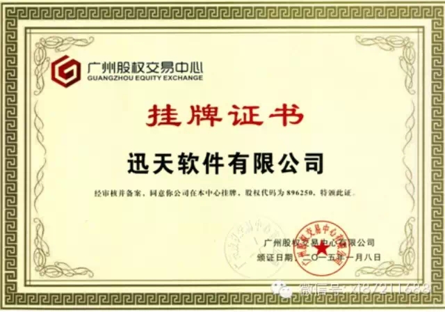 2015年1月8日,迅天軟件有限公司在廣州股權(quán)交易中心成功掛牌,股權(quán)代碼為896250。 迅天軟 ...