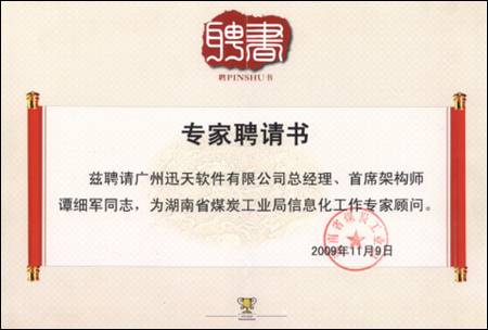 2008年7月以來,公司總經(jīng)理、首席架構(gòu)師譚細(xì)軍同志受湖南省煤炭工業(yè)局聘請(qǐng),成為湖南省煤炭行業(yè)信息化工作專家顧問。2009年11月9日,譚總正式接受了湖南省煤炭工業(yè)局的《專家聘請(qǐng)書》。